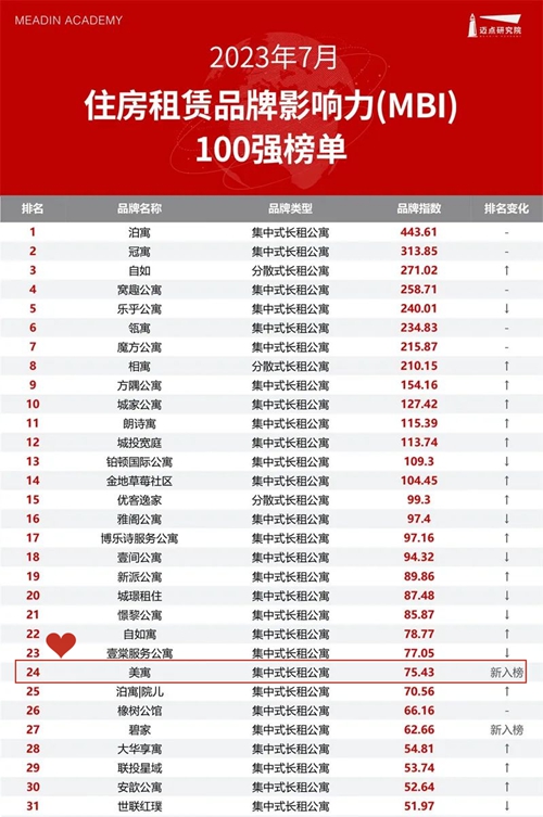 邁點研究院獨家發布的“2023年7月住房租賃品牌影響力(MBI)100強榜單”。鄭州城市發展集團城發美寓進入榜單前二十五。