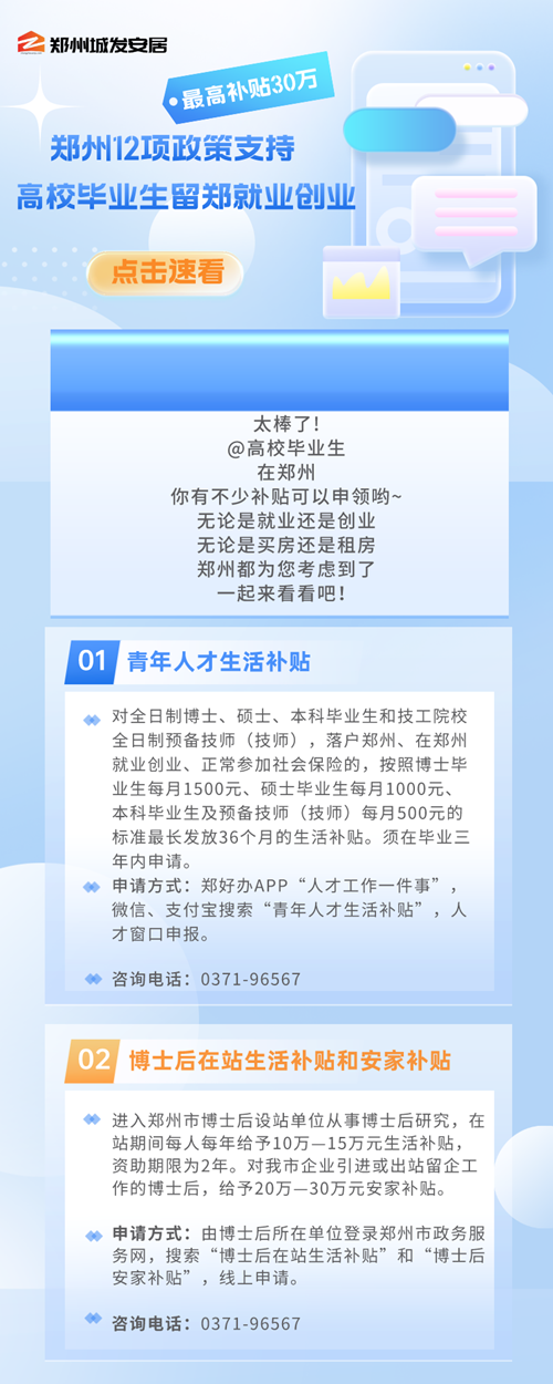 近年來,鄭州市通過盤活存量房源用作人才公寓、發放購房租房補貼等形式,多渠道解決人才階段性居住需求。比如,鄭州市創新實施人才補貼,除了人才公寓以外,符合條件的博士、碩士、學士學位畢業生,5年內分別可享每月3000元、1500元、1000元房租補助,購房給予10萬元到30萬元不等的一次性購房補貼。