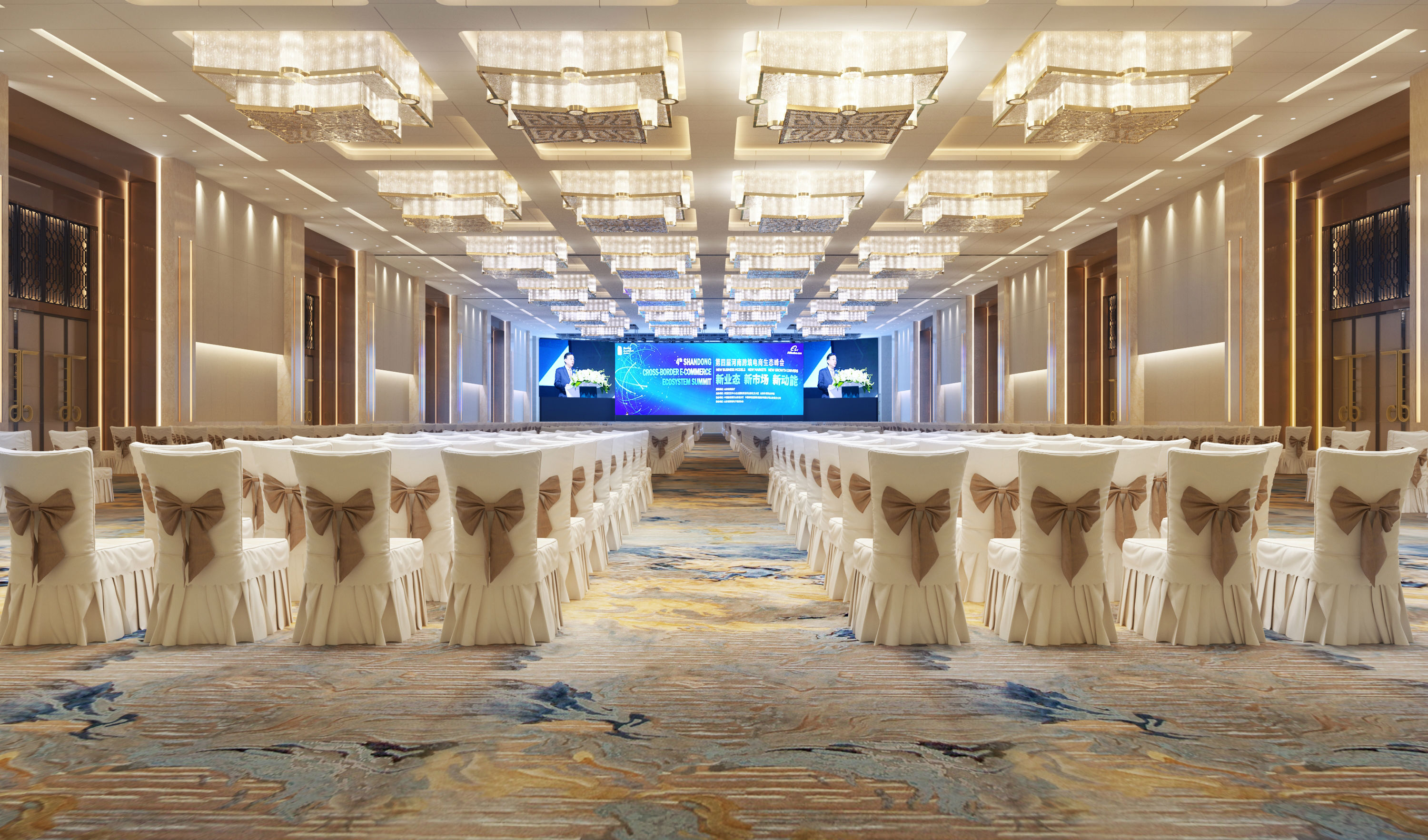奧體中心展覽廳位于鄭州市奧林匹克體育中心游泳館下方,緊鄰鄭州“四個中心”中央大街,總建筑面積約8500平方米,包含3000平方米展覽廳、大堂前廳、設備房等配套設施工程。項目整體設計理念取“黃河天水”及“商合”之意,采用了大量的“黃河”及“商都”兩大彰顯地域特色的設計元素,表現出韻味十足的鄭州商都文化特色,同時又兼具現代會展會務的簡約風格。