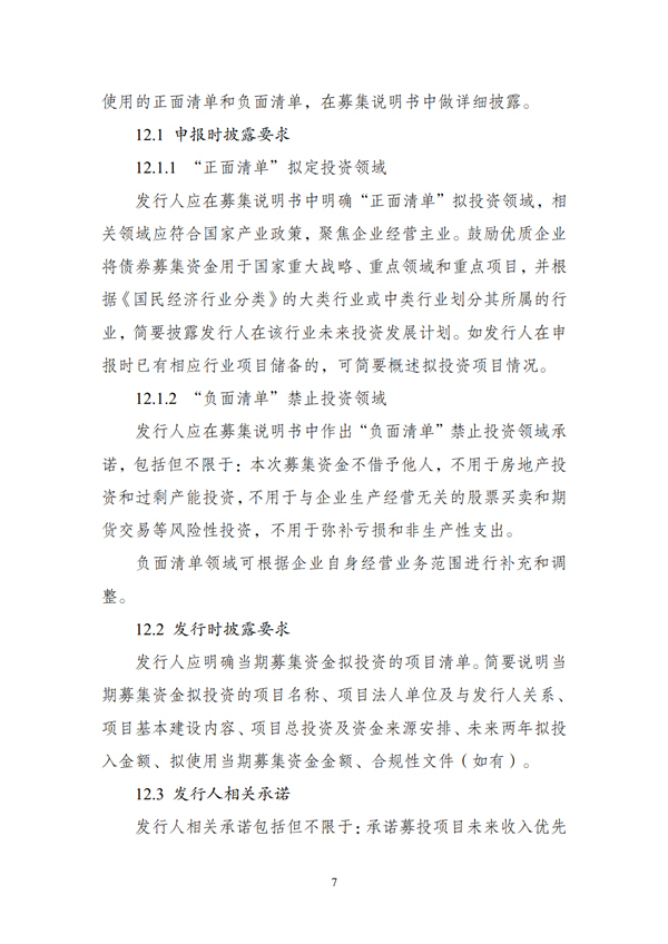 (二)申報材料應明確債券募集資金禁止投向領域,形成“負面清單”。“負面清單”包括但不限于:將募集資金借予他人,用于房地產投資和過剩產能投資,用于與企業生產經營無關的股票買賣和期貨交易等風險性投資,用于彌補虧損和非生產性支出。“負面清單”領域可根據企業自身經營業務范圍進行補充和調整。