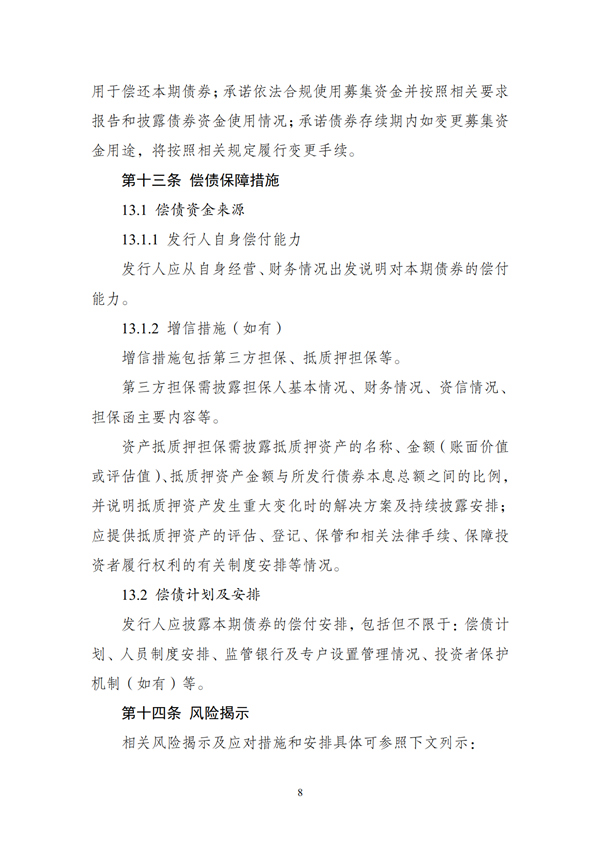 (二)發行人應按照監管部門和交易場所的規定,在存續期內定期披露財務情況、經營情況、募集資金使用情況、項目進展情況等相關信息。如存續期內變更募集資金用途或發生其他對債券持有人權益有重大影響的事項,應符合相關法律法規和政策要求,按照有關規定或約定履行程序,并及時公告。